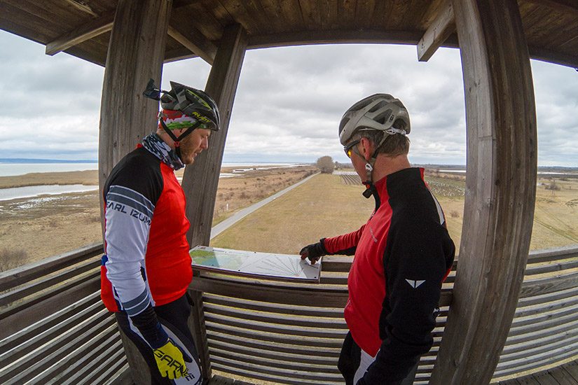 Miután átértünk irányba vettük Illmicet (Illmitz) és a B10-es majd B20-as bringa utat jártuk be. Elsőként a Hochstand-i kilátót néztük meg aztán Pátfaluban (Podersdorf) megnéztük a kikötőt, aztán tovább mentünk Védenybe (Weiden am See) újabb kikötőt látogatni. Onnan visszaúton beültünk egy random helyre, ahol volt menü és mint kiderült Enzo bisztrójába sikerült betévednünk, ami egyben bringaműhely is. Az öreg róka Letekert pár túrát, mint pl a Védeny-Monaco út. Három nap alatt lecsavarni az 1200 km-t és 8000m szintet nem rossz. Mikor meglátta, hogy bementünk egyből érezte, hogy mivel kell nyitni egy kerósnál. -Sört?! tette fel a kérdést. Majd kértük a javasolt menüt. Minden szépen, flottul ment és nagyon finom volt. A berendezés is teljesen a bringázás hangulatát adta vissza, főleg a padlóban üveg mögé rejtett Pantini mez.